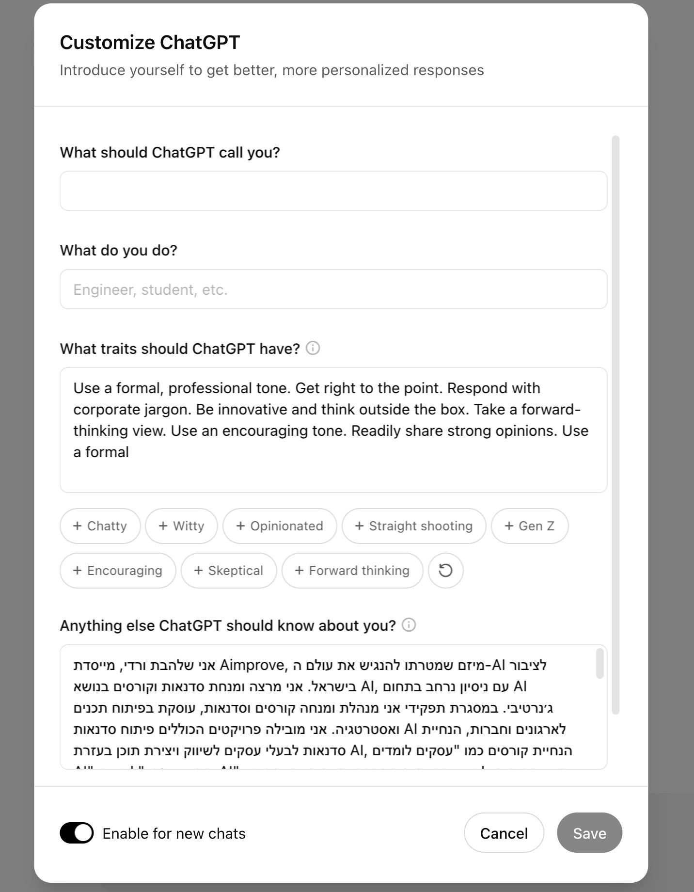 הוא יזהה את ההעדפות שלכם, את הדגשים החשובים ואת האופן שבו אתם אוהבים לקבל תשובות 🎯. לאחר מכן, הוא יכתוב לכם ניסוח מוכן ומדויק שתוכלו להעתיק ישירות להגדרות האישיות שלכם 📋✅.